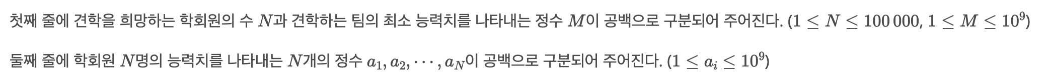 첫째 줄에 견학을 희망하는 학회원의 수 $N$과 견학하는 팀의 최소 능력치를 나타내는 정수 $M$이 공백으로 구분되어 주어진다. ($1 \le N \le 100\,000$, $1 \le M \le 10^9$) 둘째 줄에 학회원 $N$명의 능력치