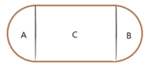 위의 그림에서 영역 A와 B는 반원이며, 영역 C는 직사각형이다. 영역 C의 가로의 길이를 d1, 영역 A의 반지름의 길이 d2의 값이 주어지면 운동장의 한 바퀴 둘레를 알아내는 프로그램을 작성하시오. (단, 이 문제에서는 π (원주율)의 값을 3.141592라고 한다.)