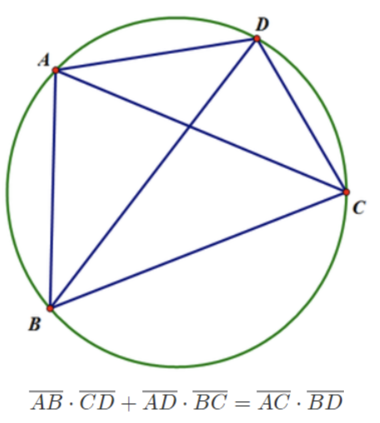톨레미의 정리에 따르면 다음과 같이 원에 내접한 사각형은 마주 보는 두 쌍의 변의 곱의 합이 두 대각선의 곱과 같다.