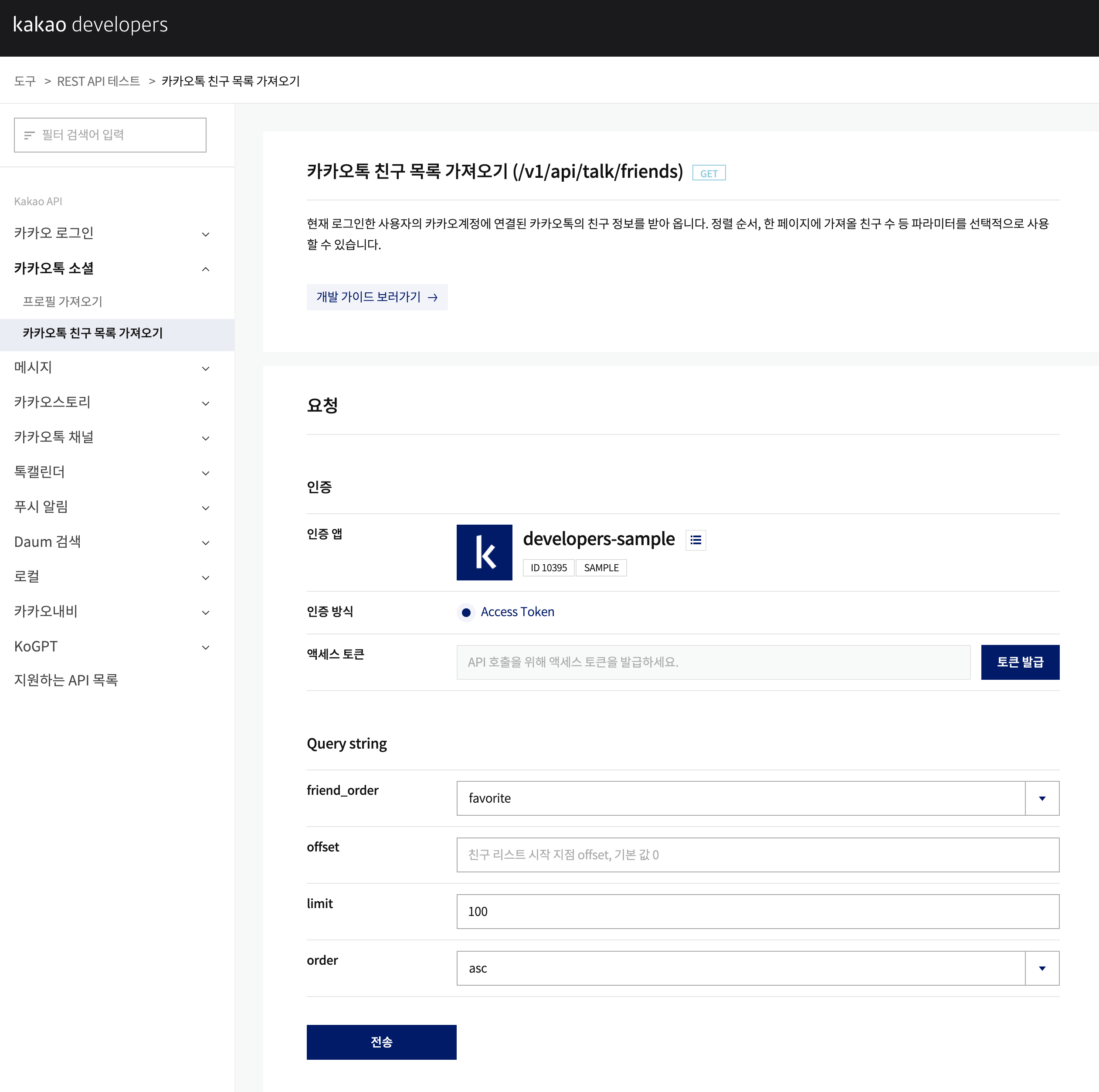 도구 > REST API 테스트 > 카카오톡 소셜 > 카카오톡 친구 목록 가져오기