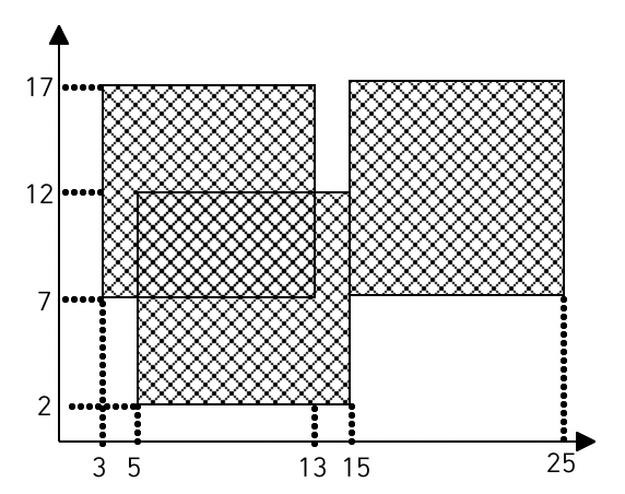예를 들어 흰색 도화지 위에 세 장의 검은색 색종이를 그림과 같은 모양으로 붙였다면 검은색 영역의 넓이는 260이 된다.