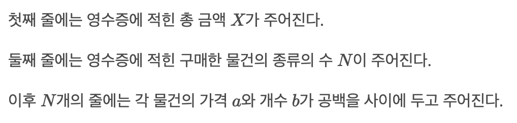 준원이는 저번 주에 살면서 처음으로 코스트코를 가 봤다. 정말 멋졌다. 그런데, 몇 개 담지도 않았는데 수상하게 높은 금액이 나오는 것이다! 준원이는 영수증을 보면서 정확하게 계산된 것이 맞는지 확인해보려 한다.