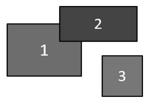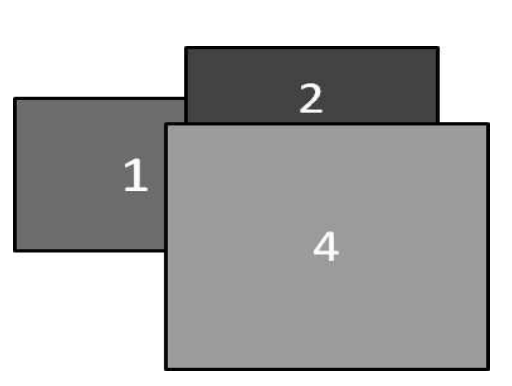 여기에 그림-2에서 보인 것처럼 4번 색종이가 하나 더 놓이면 3번 색종이는 완전히 가려서 보이지 않게 된다. 그리고, 1번 색종이와 2번 색종이는 부분적으로 가려 보이며, 4번 색종이는 완전히 보이게 된다.