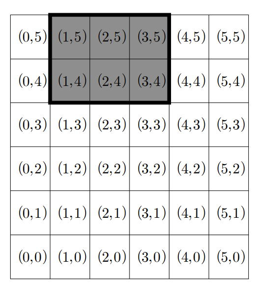 편의상 가로 6칸, 세로 6칸으로 이루어진 격자의 예를 들어 설명하면, 각 칸에 표시된 값 (a,b)는 해당 칸의 번호를 나타낸다. 가장 왼쪽 아래의 칸은 (0,0) 가장 오른 쪽 위의 칸은 (5,5)이다.