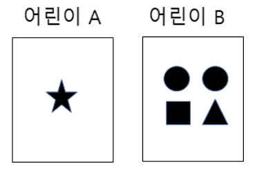 예를 들어, 두 어린이 A, B가 낸 딱지가 다음 그림과 같다고 하자.