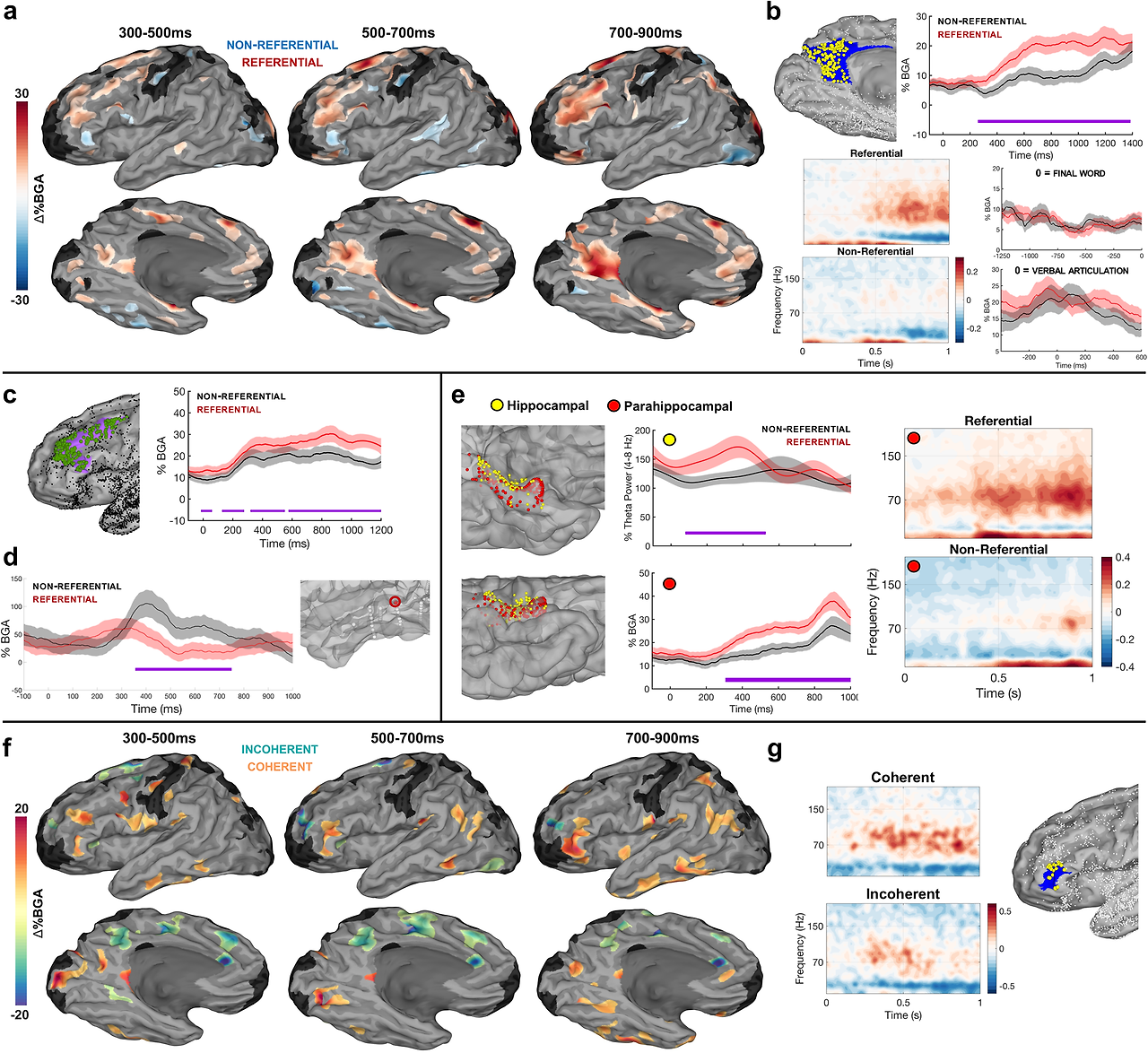 이러한 효과는 환자의 언어적 조음과는 반대로 최종 단어가 시작된 직후에 특정적으로 나타났음(Fig. 3b) - Referential sentence를 자극으로 받을 때의 전두엽(Fig. 3c) 및 내측 측두엽(Fig. 3e) 반응과