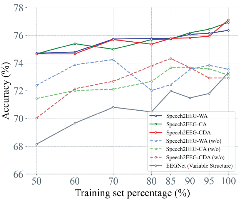 - 훈련 데이터의 크기를 최대 40%까지 줄였을 때, Speech2EEG 방식이 여전히 EEGNet 방식보다 성능이 뛰어남