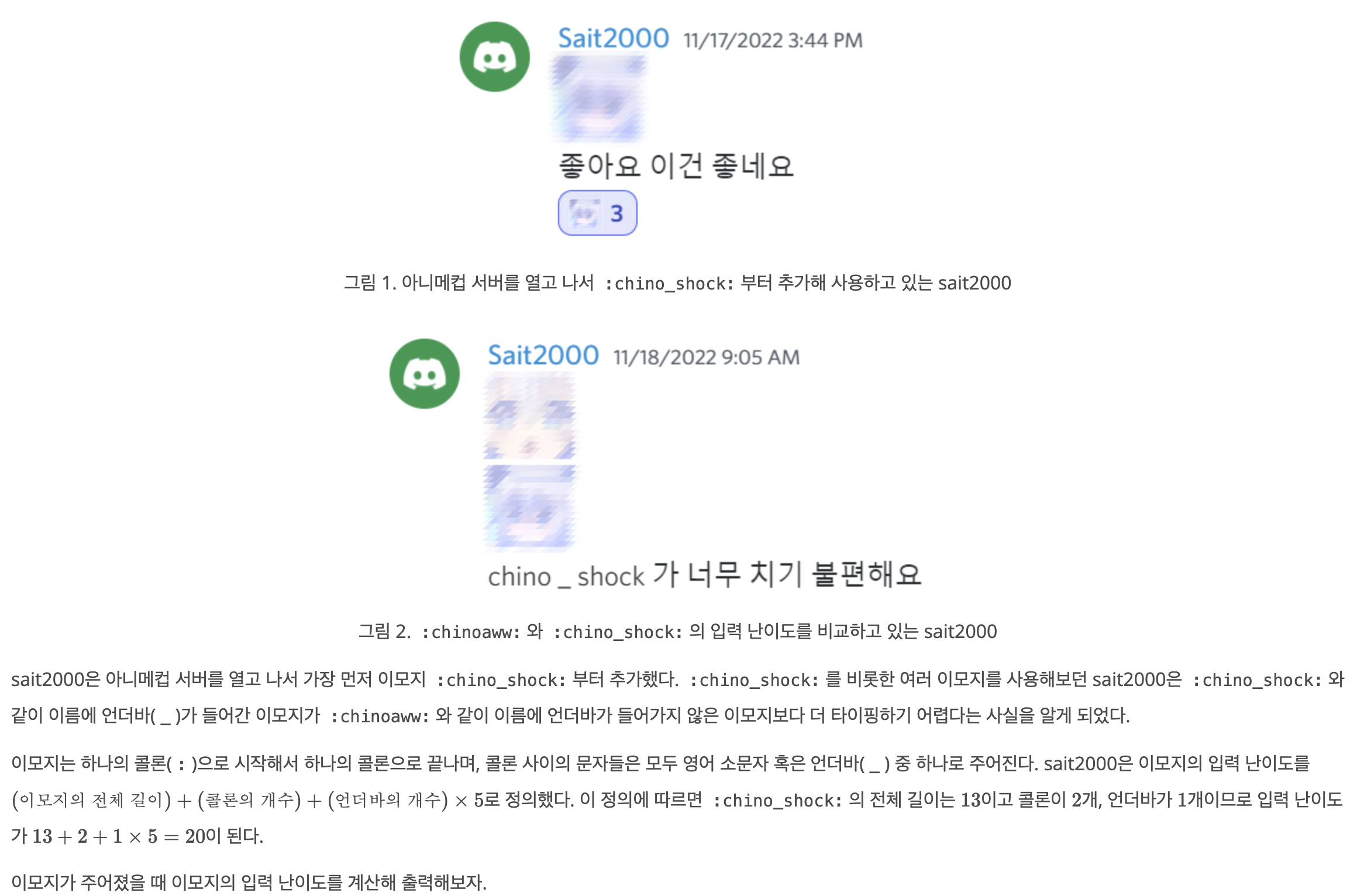 첫 번째 줄에 이모지가 주어진다. 주어지는 이모지는 항상 :chino로 시작하고 :로 끝나며, 전체 길이가 $7$ 이상 $32$ 이하이다.